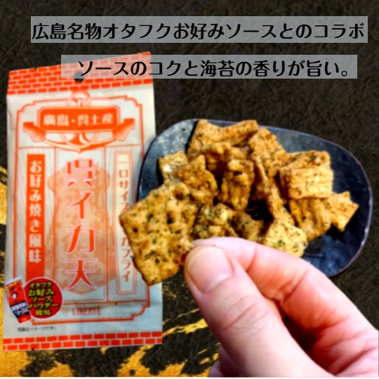イカフライスナックお好み焼き風味は、広島名物オタフクお好みソースとのコラボ商品です。ソースの旨味の香りをお楽しみください。