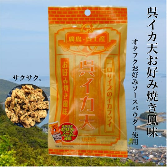 おつまみタイムにぜひどうぞ!お好み焼き風味イカ天は、飲み物と一緒に楽しむのにぴったりです。「呉イカ天お好み焼き風味」は、サクサク感が絶妙で、オタフクお好みソースパウダーを使用した香ばしい味わいが特徴です。特別な時間に、ぜひこの呉イカ天をお試しください。