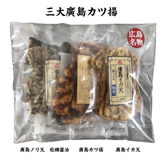 「三大廣島揚げ天」は、それぞれに違った味わいを感じることが出来るお得なセットです。おやつやお酒のおつまみに最適です。ぜひこの三大廣島揚げ天をお試しください。