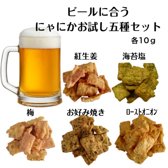 (送料無料)にゃにか お試し5種セット ※日付指定できません。 ※発送から2日程度でお届け。 多彩な味わいを楽しめる、にゃにかのお試し5種セット 「にゃにかお試し5種セット」は、手軽に様々な風味をお試しいただけるバラエティセットです。にゃにか自慢の5つの味を詰め込んでお届けします。担当者おススメの甘酸っぱ梅味、風味の良い紅生姜、愛情抜群海苔塩、オタフクお好みソースとの初コラボお好み焼き風味、旨味たっぷりローストオニオン。どれも独自の風味と食感が魅力!普段のスナックビールのお供にぴったりで、友人や家族との集まりでも大好評です。新たな味の発見ができること間違いなしです! お手軽にお試し下さい。 ■ カラー/サイズ/バリエーション ・内容量:にゃにか梅、にゃにか紅生姜、にゃにか海苔塩、にゃにかお好み焼き風味、にゃにかローストオニオン ■ 素材/製造国 にゃにか各製品は、厳選された材料を使用し、信頼のおける国内工場で製造されています。品質にこだわった商品をお届けします。 ●主成分及び製造国:具体的な原材料の記載 にゃにか梅:イカシート(イカ、魚肉、還元水あめ、その他)(国内製造)植物油、小麦粉、でん粉、梅かつおシーズニング、砂糖、食塩、乾燥卵白、植物性たん白、香辛料、たん白加水分解物/加工でん粉、調味料(アミノ酸等)、酸味料、香料、紅花色素、香辛料抽出物、ケイ酸カルシウム、甘味料(スクラロース)、(一部に小麦・卵・いか・大豆・ごまを含む) にゃにか紅生姜:イカシート(イカ、魚肉、還元水あめ、その他)(国内製造)植物油、小麦粉、でん粉、紅生姜シーズニング、砂糖、食塩、乾燥卵白、植物性たん白、香辛料、たん白加水分解物/加工でん粉、調味料(アミノ酸等)、香辛料抽出物、着色料(紅花赤)、酸味料、リン酸カルシウム、甘味料(スクラロース)、(一部に小麦、卵、いか、大豆、ごまを含む) にゃにか海苔塩:イカシート(イカ、魚肉、還元水あめ、その他)(国内製造)植物油、小麦粉、でん粉、青さ塩シーズニング、砂糖、塩、乾燥卵白、植物性たん白、香辛料、たん白加水分解物/加工でん粉、調味料(アミノ酸等)香辛料抽出物、微粒二酸化ケイ素、甘味料(スクラロース)(一部に小麦・卵・イカ・大豆・ごまを含む) にゃにかお好み焼き風味:イカシート(イカ、魚肉、還元水あめ、その他)(国内製造)、植物油、小麦粉、でん粉、お好みソースパウダー、砂糖、食塩、乾燥卵白、あおさ、けずり粉、植物性たん白、香辛料、たん白加水分解物/加工でん粉、調味料(アミノ酸等)カラメル色素、酸味料、香辛料抽出物、甘味料(スクラロース、ステビア)、(一部に小麦、卵、いか、大豆、ごま、りんご、さばを含む) にゃにかローストオニオン:イカシート(イカ、魚肉、還元水あめ、その他)(国内製造)植物油、小麦粉、でん粉、オニオンシーズニング、砂糖、食塩、乾燥たん白、植物性たん白、香辛料、たん白加水分解物/加工でん粉、調味料(アミノ酸等)香料、香辛料抽出物、ケイ酸カルシウム、甘味料(スクラロース)(一部に小麦・卵・いか、大豆・ごまを含む) ■ 栄養成分 にゃにか梅:100gあたり・・・熱量570.3kcal、タンパク質13.6g、脂質35.4g、炭水化物50.2g、食塩相当量3.24g(推定値) にゃにか海苔塩:100gあたり・・・熱量566.4kcal、タンパク質13.8g、脂質13.8g、炭水化物49.2g、食塩相当量3.5g(推定値) にゃにか紅生姜:100gあたり・・・熱量569.5kcal、タンパク質13.6g、脂質35.4g、炭水化物49.8g、食塩相当量3.67g(推定値) にゃにかお好み焼き風味:100gあたり・・・熱量577.9kcal、タンパク質14.0g、脂質35.6g、炭水化物51.4g、食塩相当量3.2g(推定値) にゃにかローストオニオン:100gあたり・・・熱量569.9kcal、タンパク質13.7g、脂質35.4g、炭水化物49.8g、食塩相当量3.47g(推定値) ■ お手入れ/取り扱い注意事項 ・直射日光を避け、冷暗所で保存してください。 ・開封後はできるだけ早くお召し上がりください。 ■賞味期限 120日 ■ 発送・注文に関する情報や注意事項 ・通常、発送は3~5営業日以内に行います。 ・離島等、一部地域への配送には別途料金がかかることがありますのでご了承ください。 ■ その他の情報や注意事項 ・アレルギーをお持ちの方は、原材料をよく確認の上、ご購入ください。 ・業務用としての利用ももちろん、お家庭での使用にも大変おすすめです。 商品に関するお問い合わせは、ショップのお問い合わせページよりお気軽にご連絡ください。このにゃにかのお試し5種セットで、あなたの食卓に新たな楽しみを加えてみませんか?